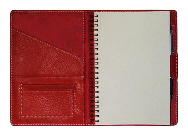Made of full-grain top quality leather, and available in Black, Red (new), Blue (new) and British Tan. It can be ordered with or without personalization imprinting. The maximum imprinting area is approximately 3" wide and 3" high.