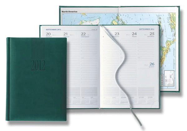 This mid-size weekly planner is made with a leather-like cover material, in a range of traditional and fashion colors. It has 128 pages, printed in blue and gray, with perforated page corners and a place-marking ribbon. The extensive reference section includes national holidays and important dates; international holidays; spaces for birthdays, anniversaries, addresses and notes; conversion tables; weights and measures; area codes; international dialing codes; toll-free numbers and frequently-visited websites. 8 3/8" x 5 7/8".Burgundy, Periwinkle, Terracotta, Red, Black, Light Green, Green, Burnt Orange, Royal Blue and Navy Blue faux leather